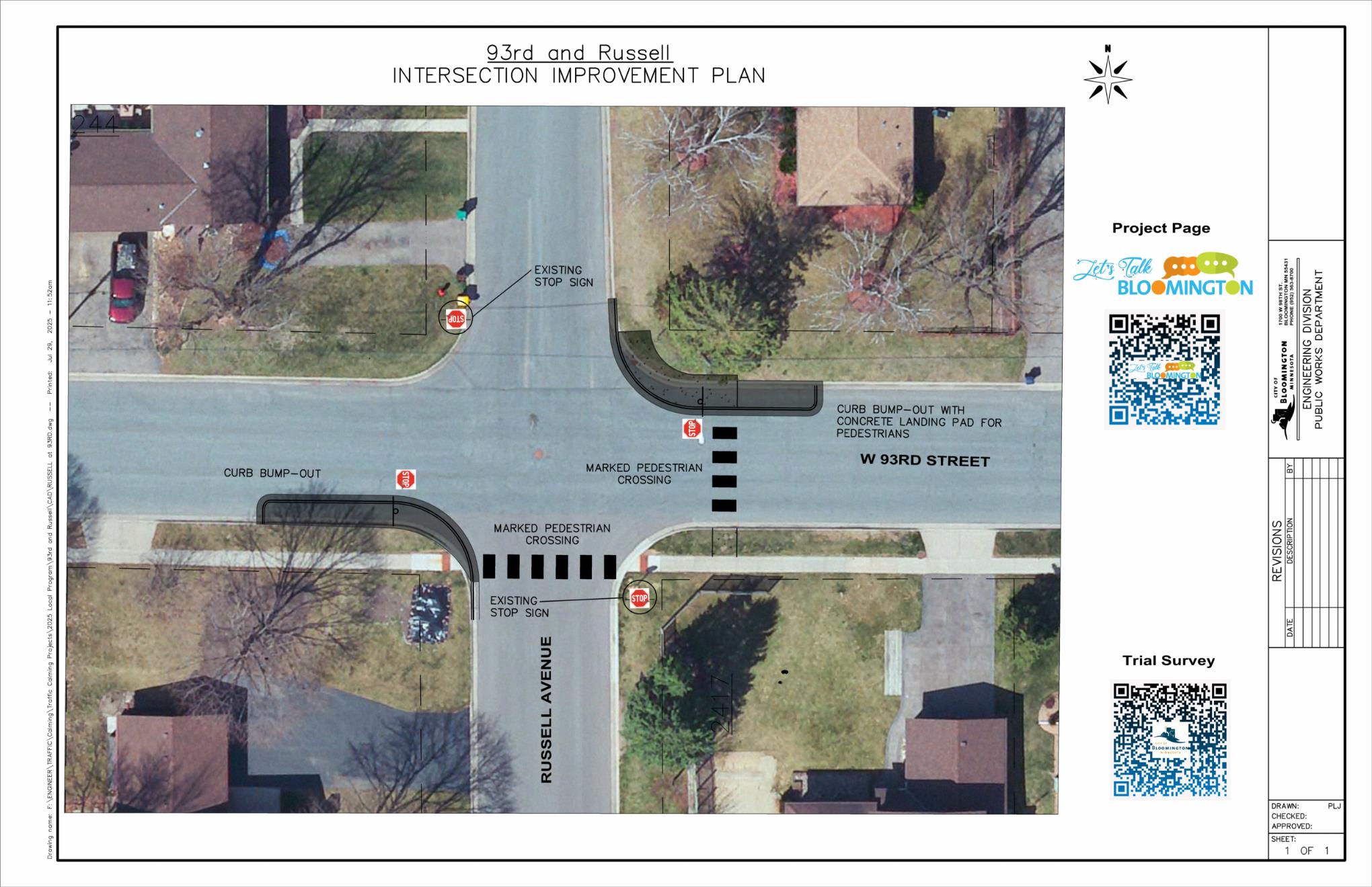 Temporary curb bump outs on the east and west approaches of W 93rd Street at Russell Avenue (SW and NE quadrants);
