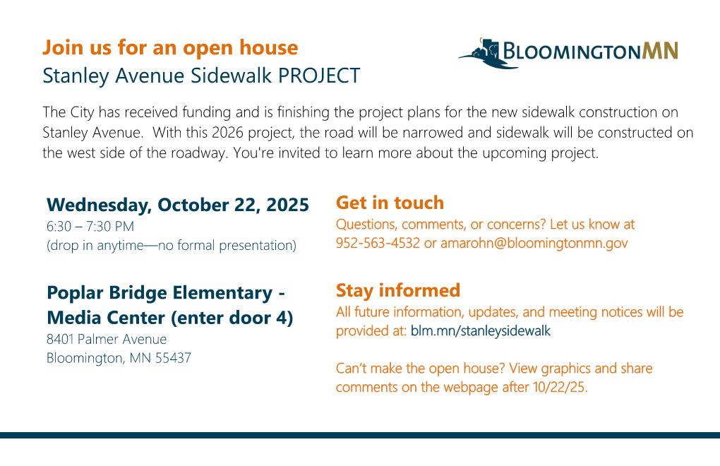 A public open house was held on Tuesday, December 3, 2024, from 6 PM to 7:30 PM in the Poplar Bridge Elementary School Cafeteria, to discuss the option of adding sidewalk along Stanley Avenue between W 84th Street and Nine Mile Creek Parkway.